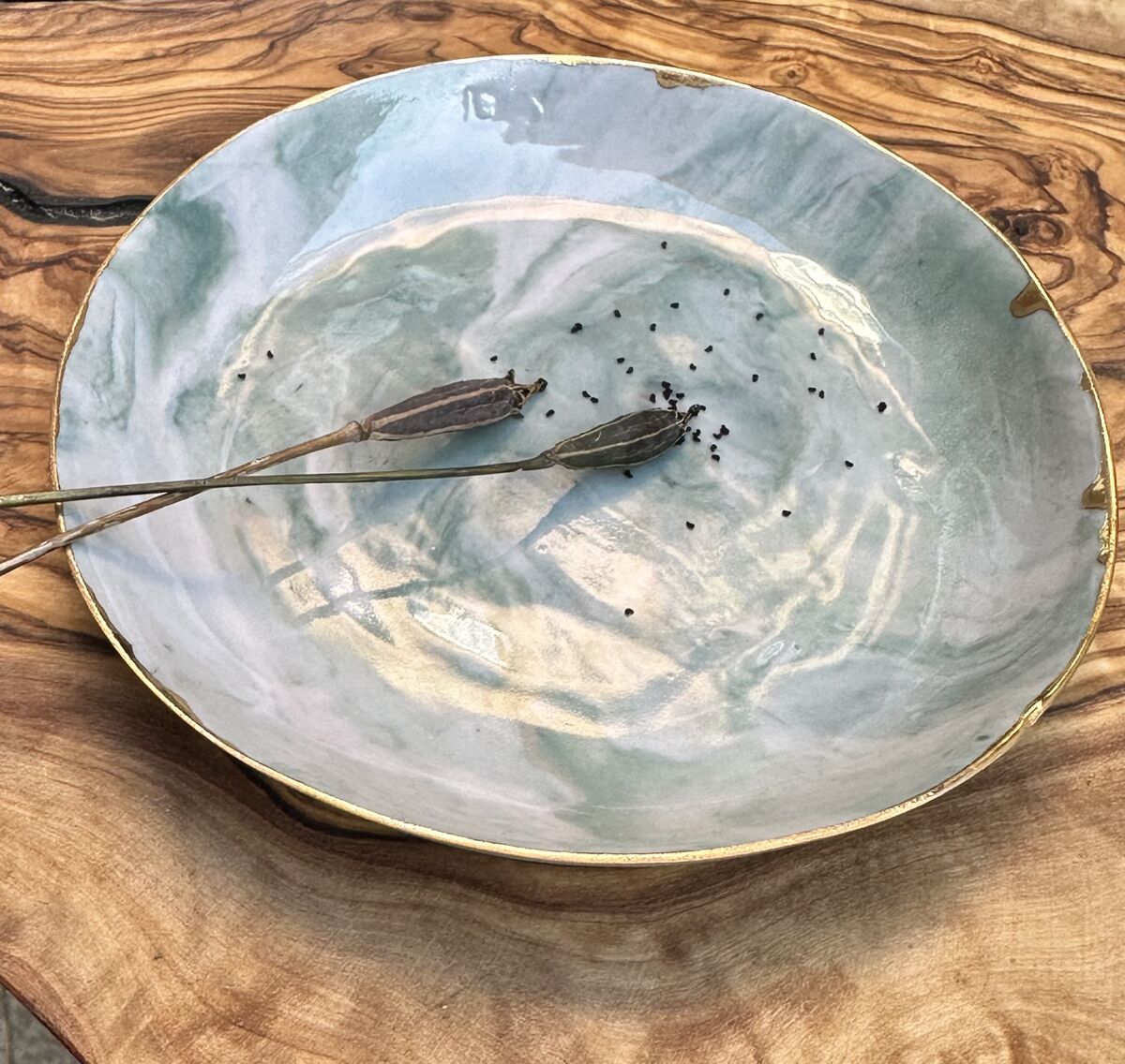 This unique dish was created using a combination of green and pink stained Porcelain slips, clear glaze & gold lustre.
